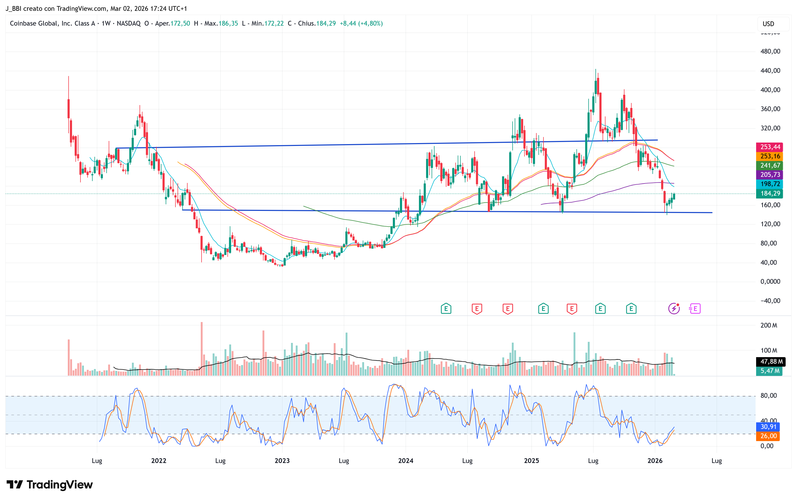 Ritengo invece più interessante cominciare a osservare da vicino Coinbase, che ha già perso molto rispetto al massimo, è su un supporto importante e potrebbe essere già entrato in una buy zone:
