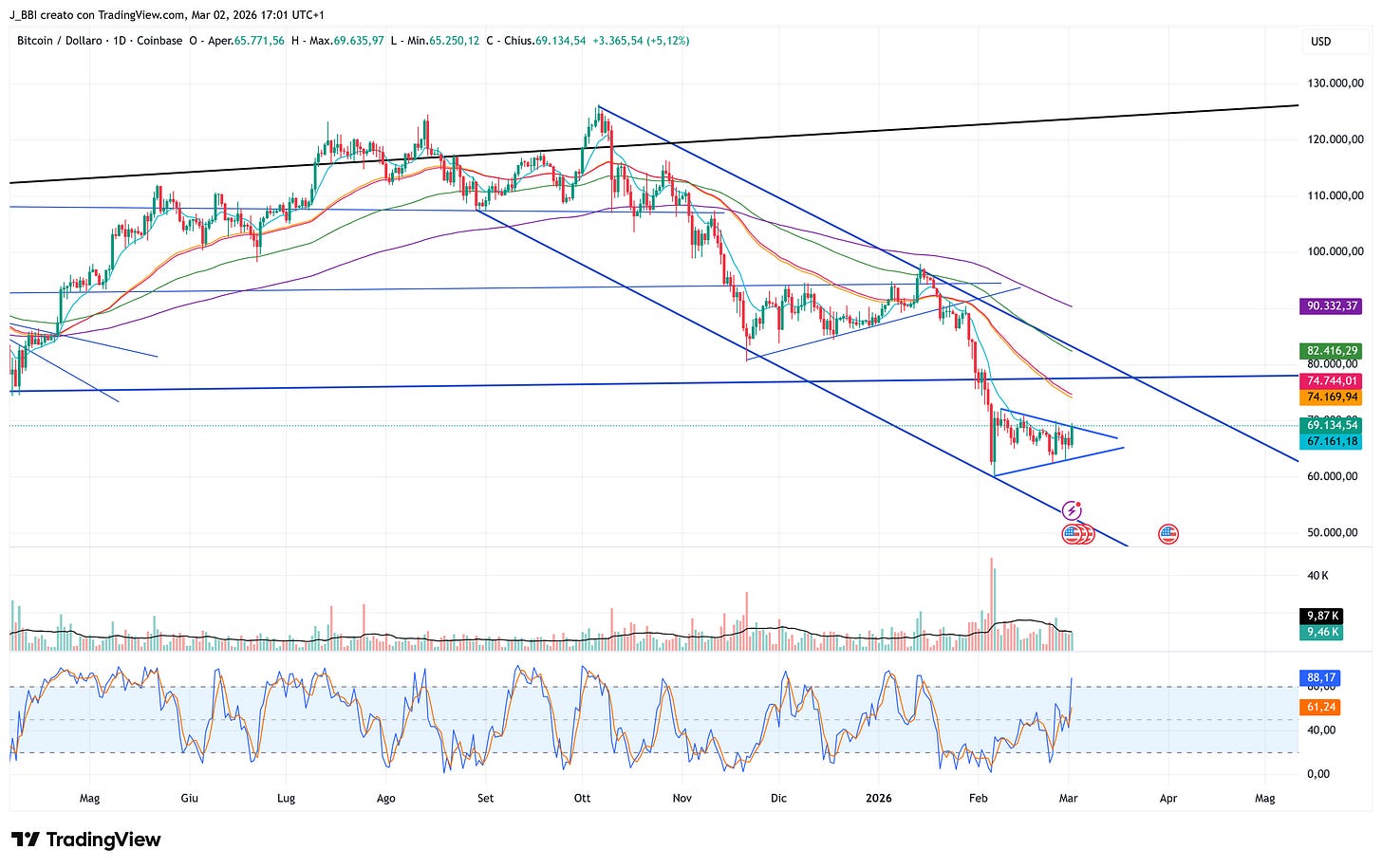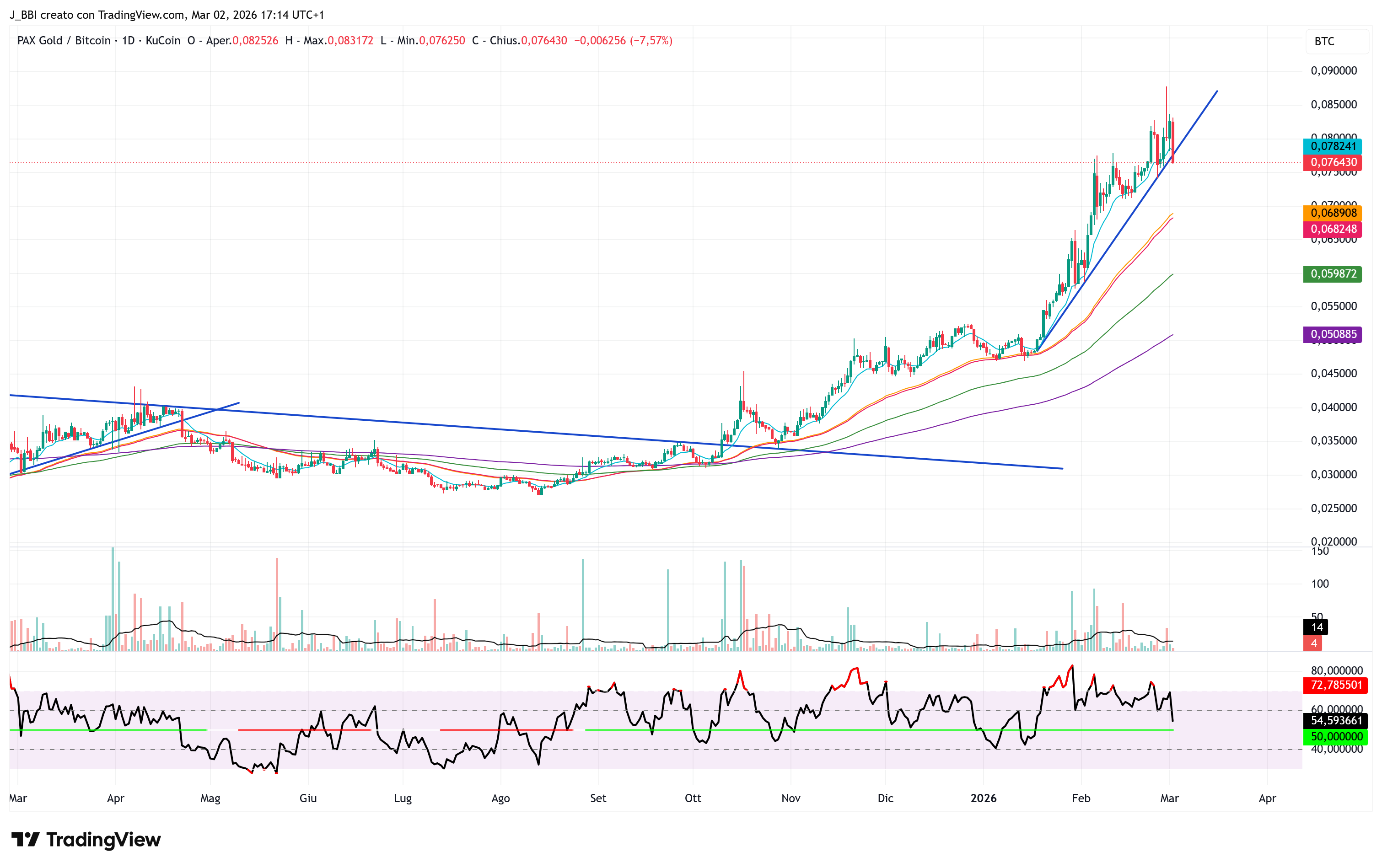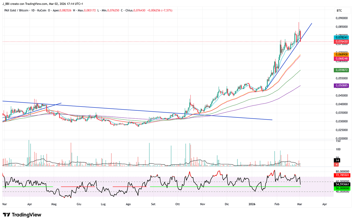 Vediamo che l’Oro è ancora long rispetto al Bitcoin, ma sta cominciando una fase di volatilità.
