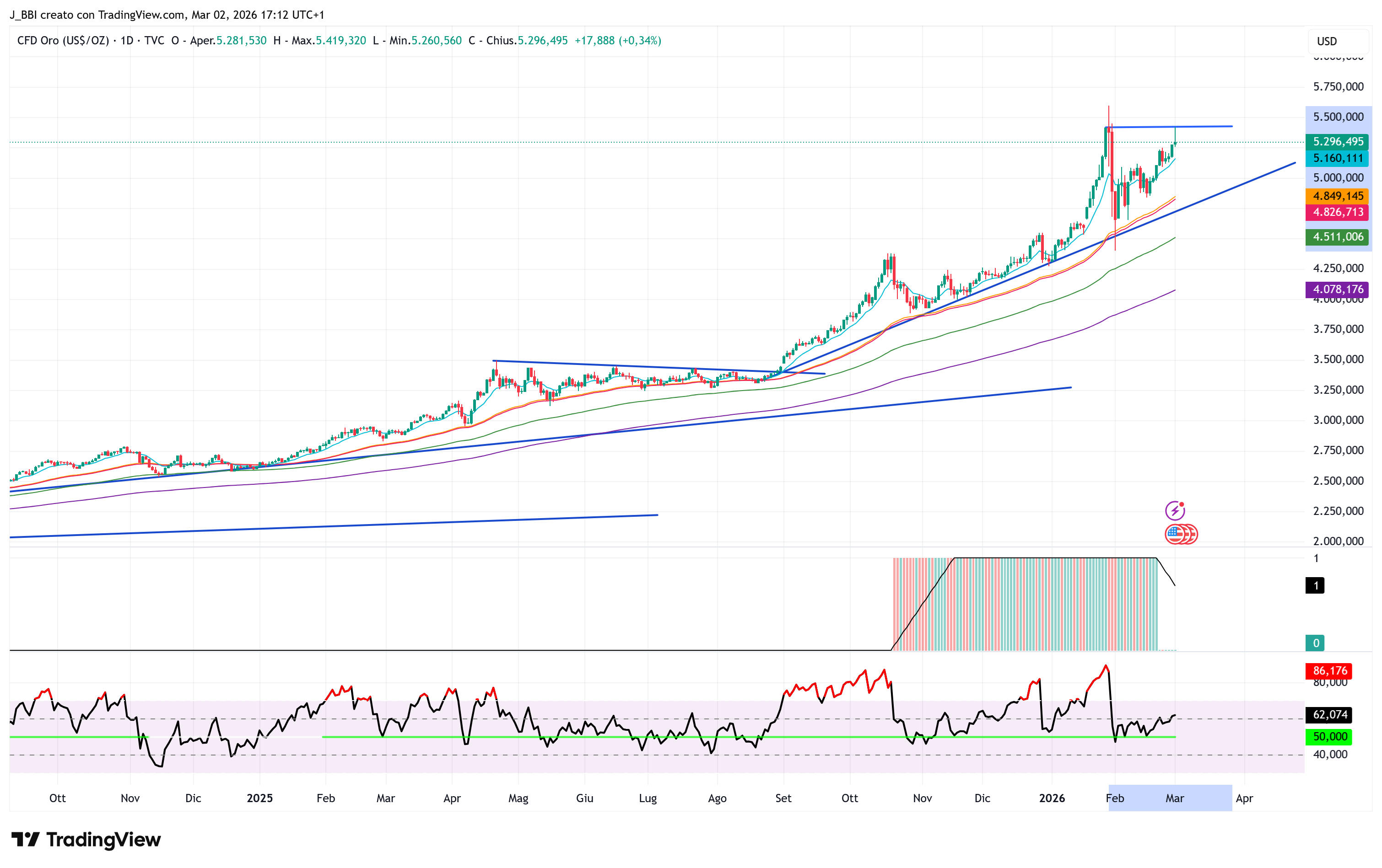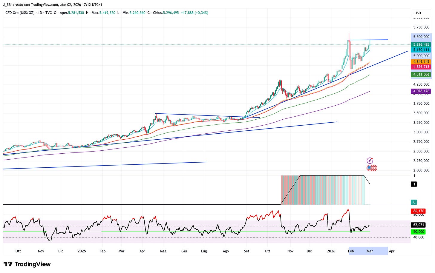 L’Oro è vicino al massimo precedente che causò il 2-02-2026 una discesa di ben 21%, quindi potrebbe esserci a breve un po di discesa, e rispetto a BTC: