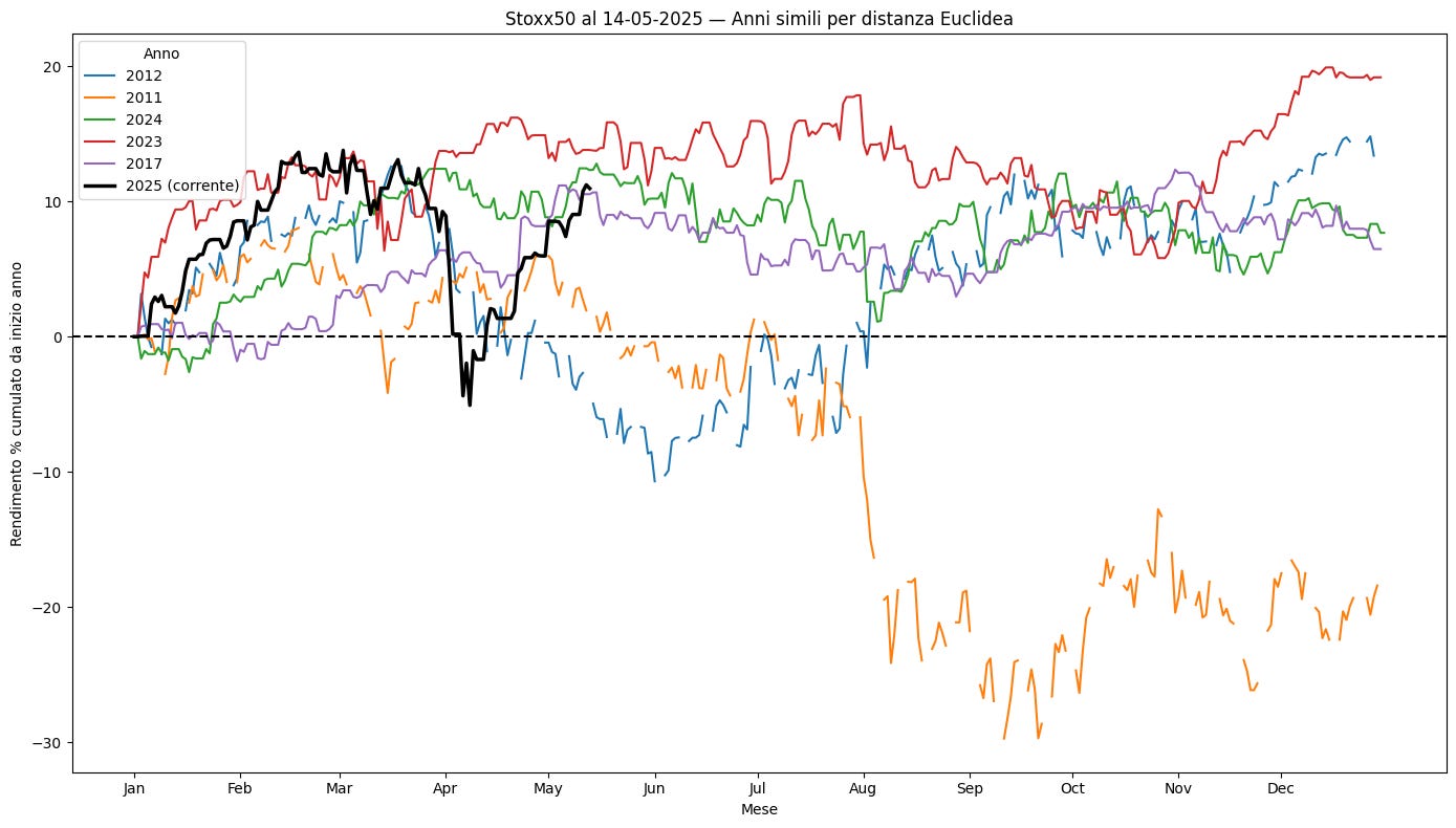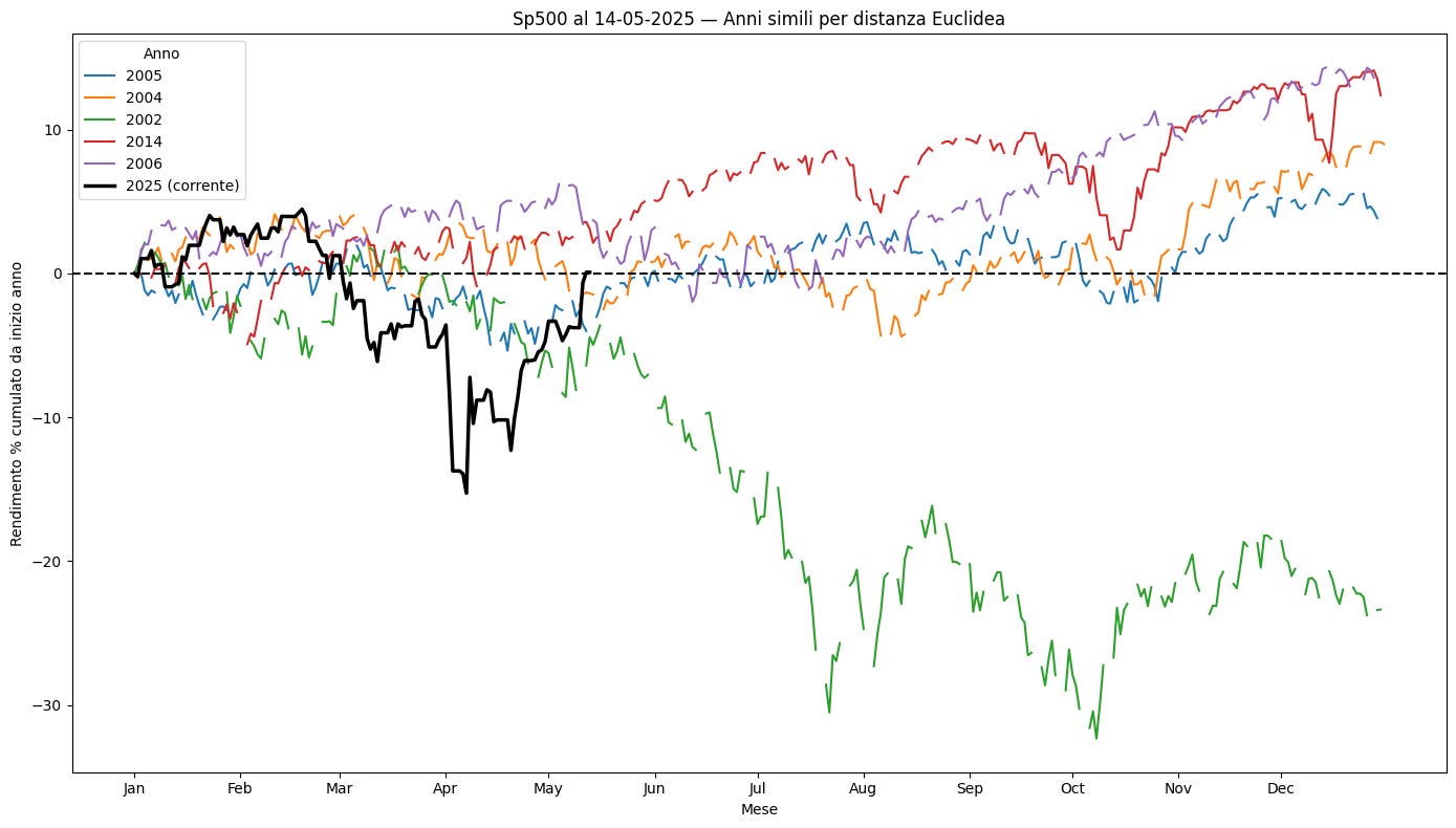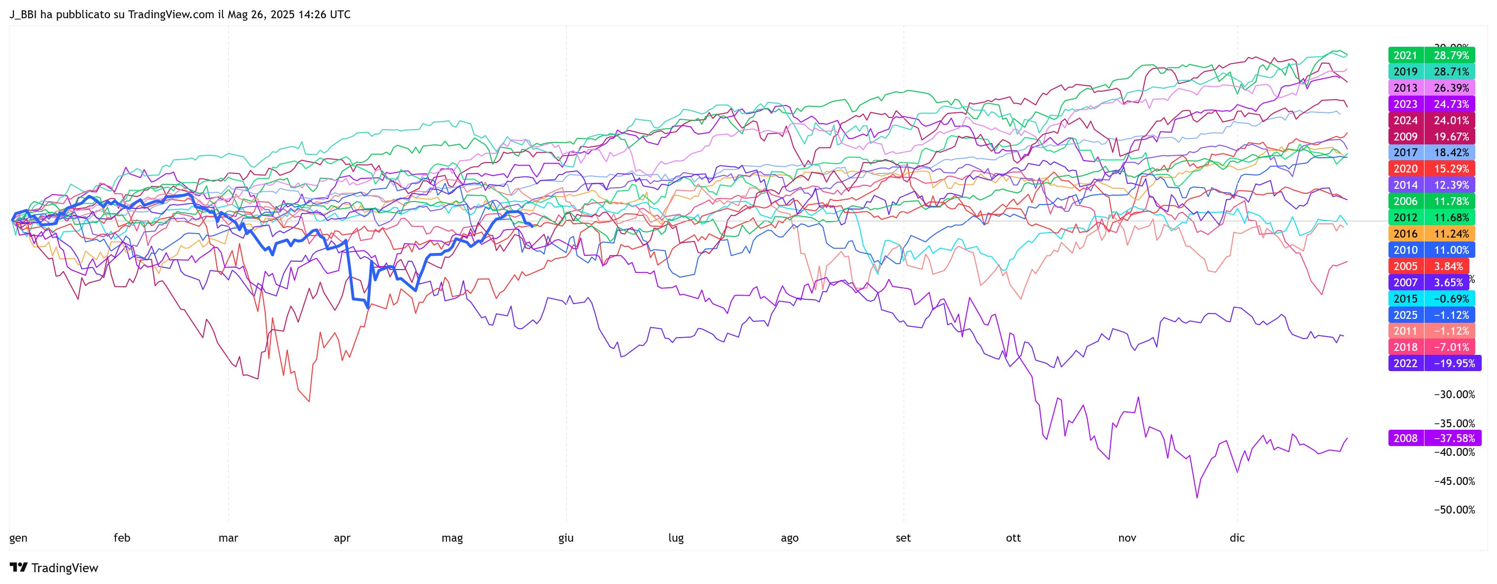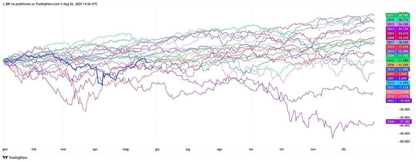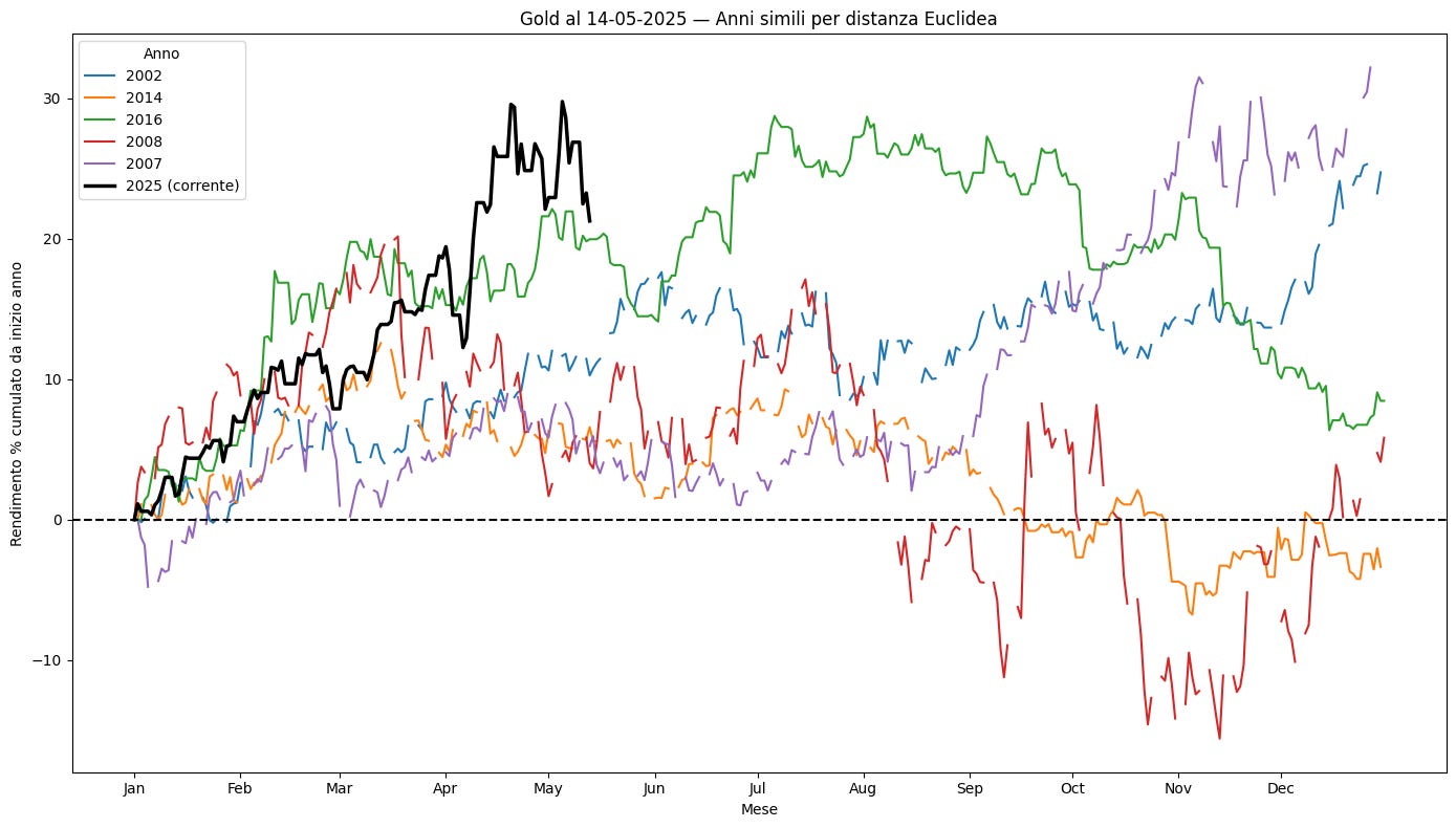 Passiamo ora al rendimento settimanale (7gg) calcolato su ogni singolo giorno, dal 1° dell'anno al 14-mag-2025.