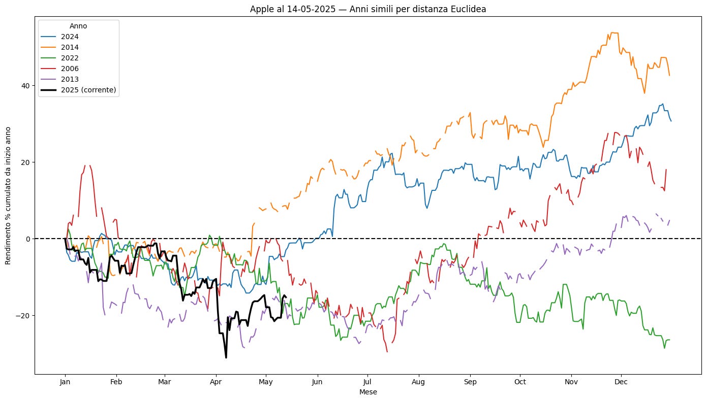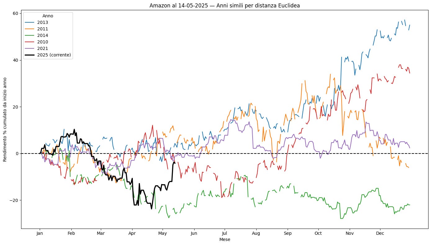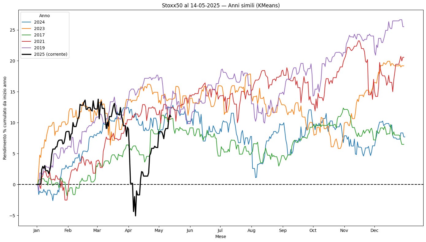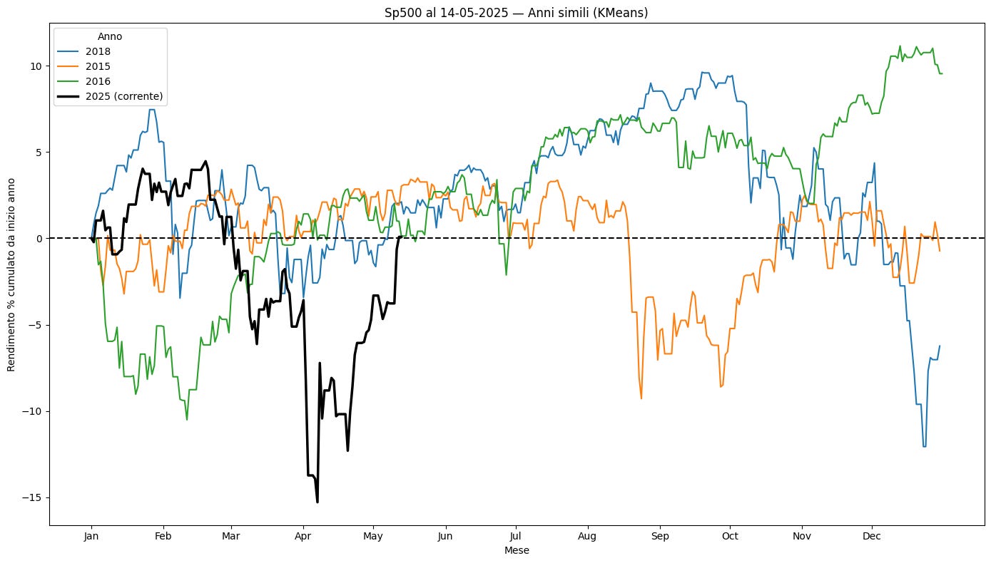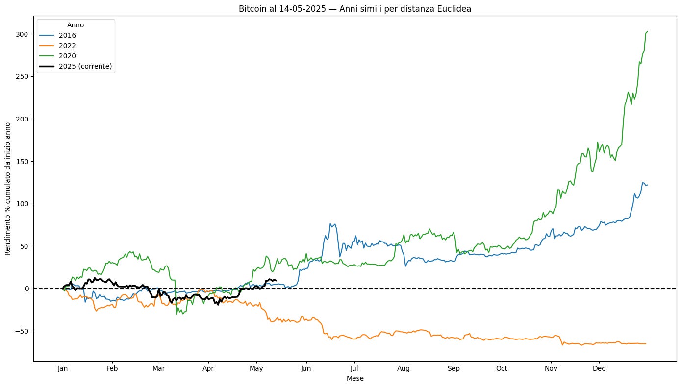 Passiamo ora al rendimento settimanale (7gg) calcolato su ogni singolo giorno, dal 1° dell'anno al 14-mag-2025.