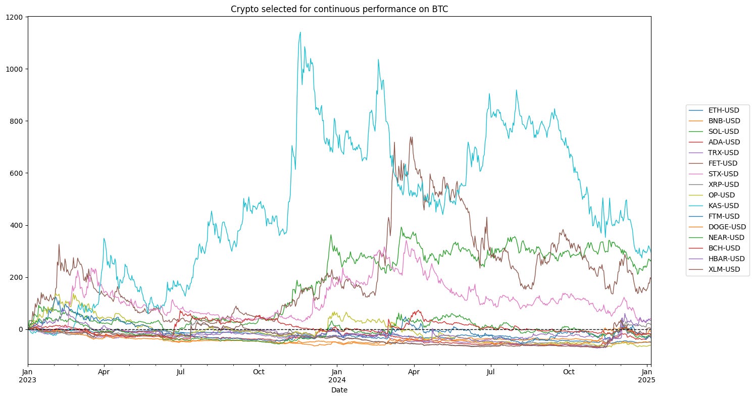 all_rendimenti_continui_onBTC.plot(ax=ax, title='Crypto for continuous performance on BTC', linewidth=1)
