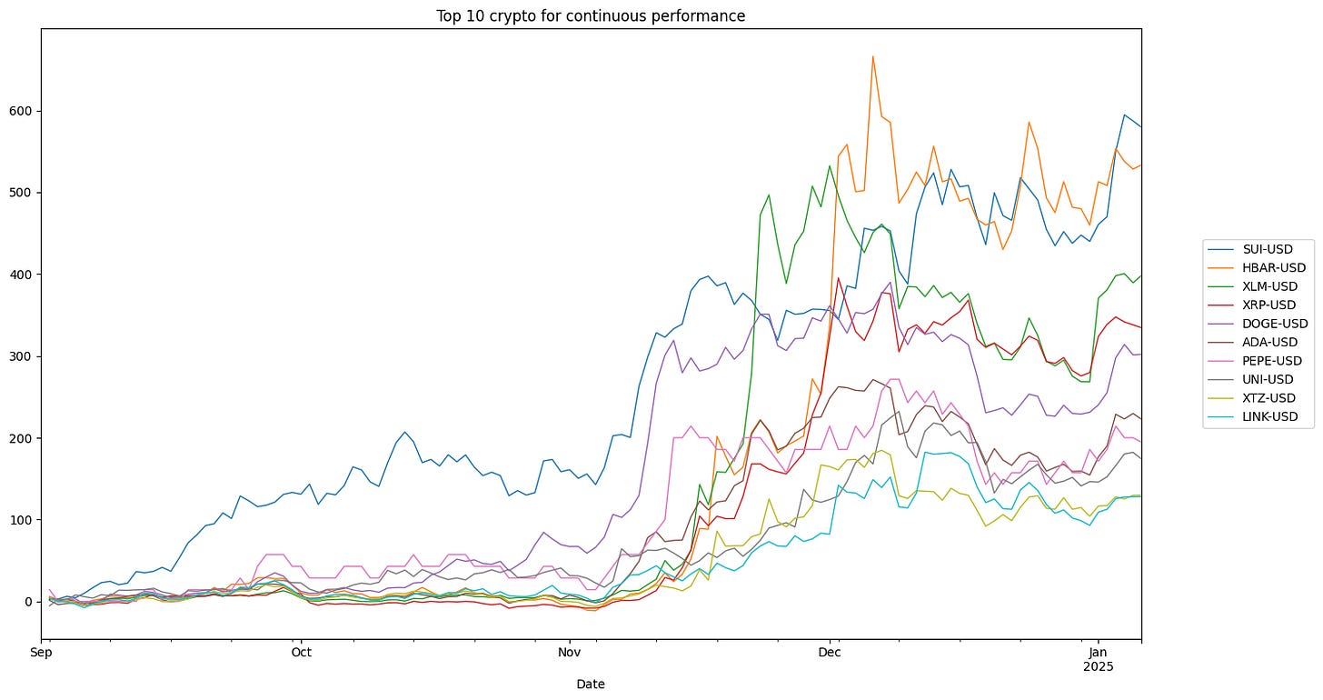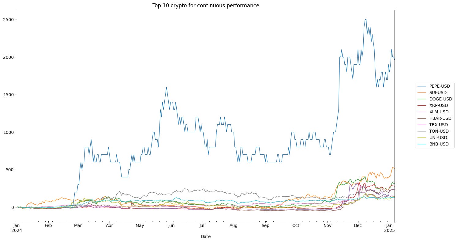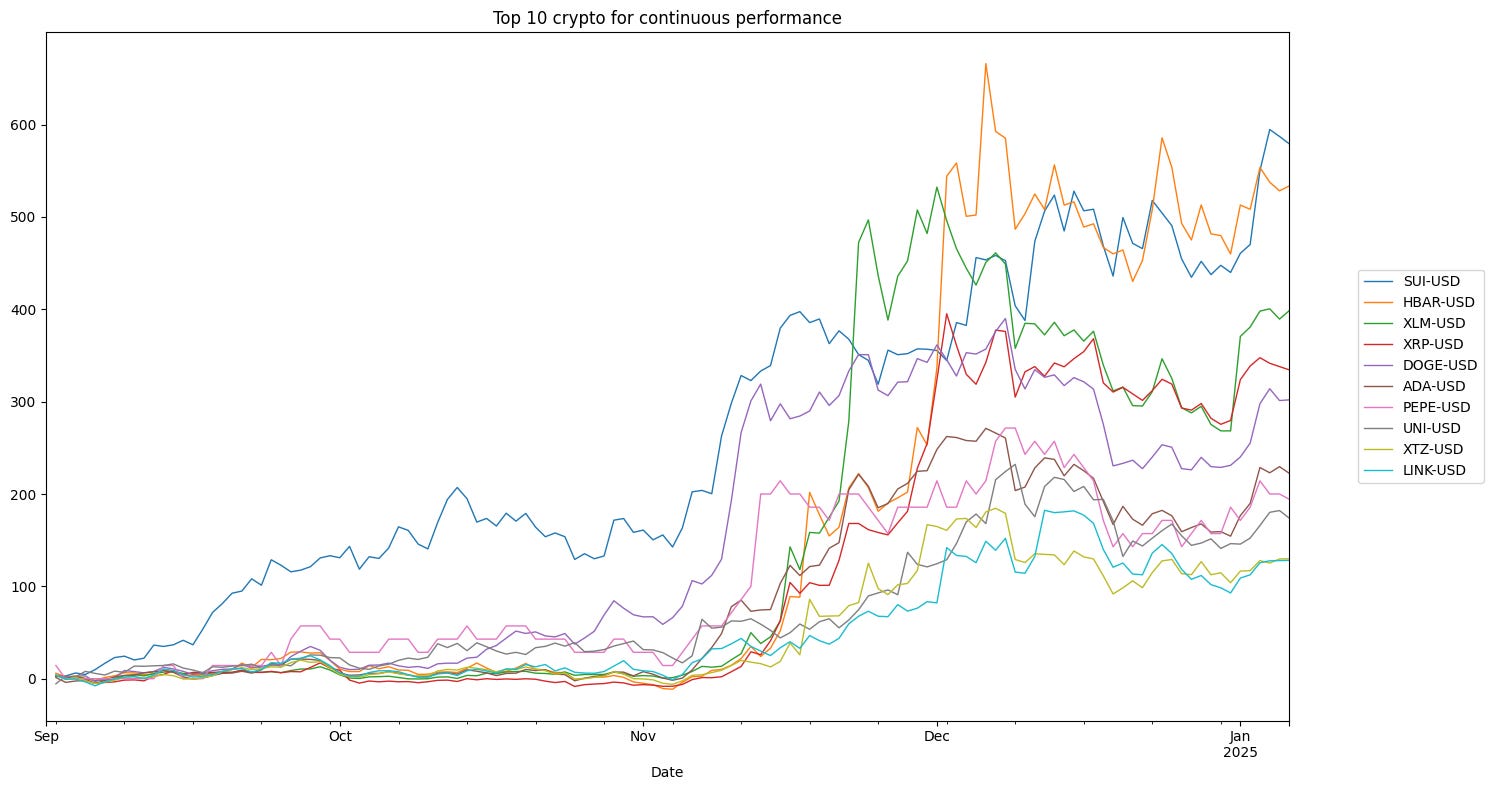 top_10_rendimenti_continui.plot(ax=ax, title='Top 10 crypto for continuous performance', linewidth=1)
