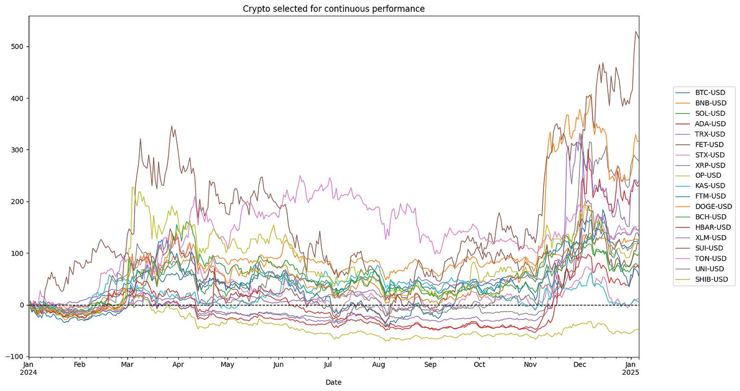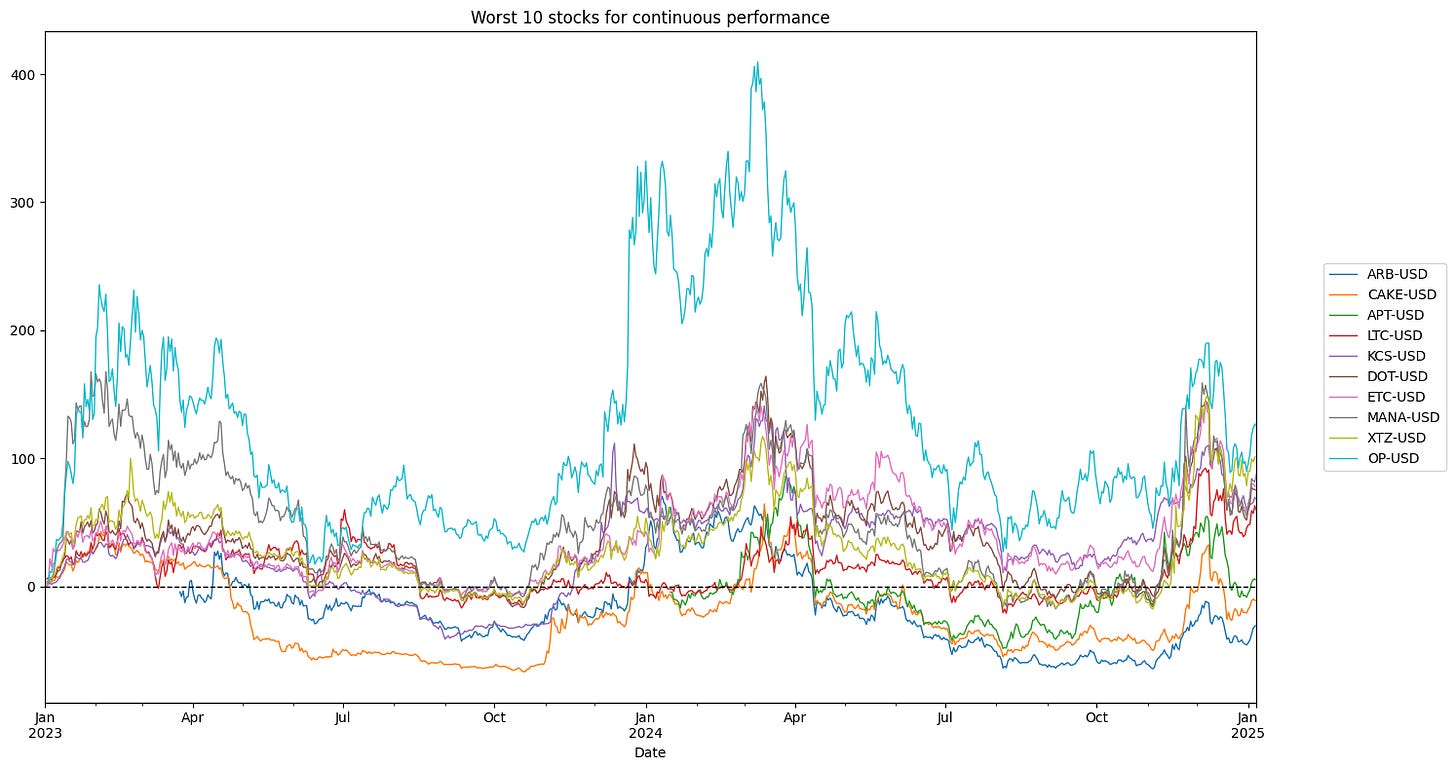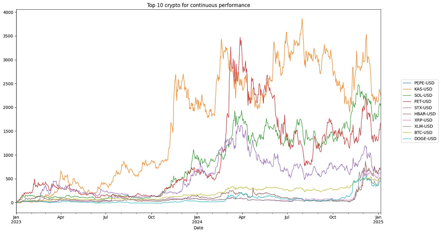 top_10_rendimenti_continui.plot(ax=ax, title='Top 10 crypto for continuous performance', linewidth=1)